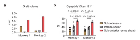 研究人员还证实,hCiPSC-islets移植后,内源胰岛素分泌水平大幅提升,且能够响应血糖浓度变化;与肝脏门静脉移植相比,新移植方案胰岛素标志物(C肽)分泌水平提升5倍以上,其中一只糖尿病猴C肽分泌水平达到了健康人的水平。这个结果表明,未来在人多能干细胞分化胰岛细胞临床移植中,接受腹直肌鞘下移植有望使糖尿病患者完全脱离胰岛素注射,实现1型糖尿病的治愈。