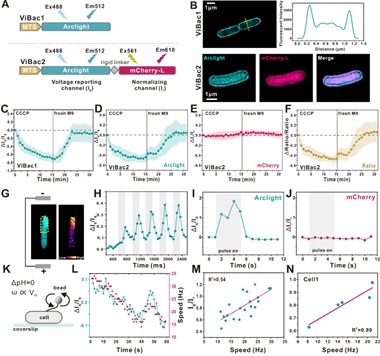 研究团队报道了两种用于追踪细菌膜电位变化的基因编码的荧光探针(Voltage Indicator for Bacteria,ViBac),其中,ViBac1是单色荧光探针;ViBac2是比率型双通道荧光探针。结构照明显微镜技术(SIM)显示ViBac探针可准确锚定在细菌膜上。通过验证ViBac对去极化及超极化试剂的响应、外加电场诱导膜电位变化等一系列的表征实验,证明ViBac1具有较高的时间分辨率,可在单细胞水平实现对膜电位的实时动态表征;ViBac2则可应用于细菌间膜电位的异质性研究(图1)。