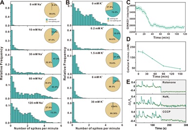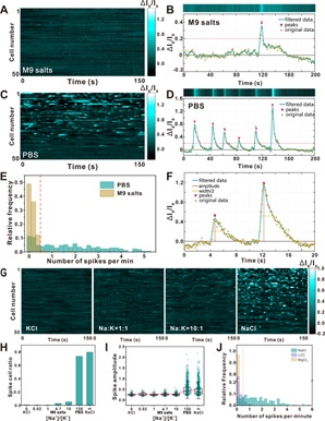 利用ViBac探针,研究团队首次报道了细菌膜电位的重复性瞬时超极化现象。在PBS和M9 salt溶液中,对数生长期的大肠杆菌中ViBac1信号动态差异显著。在PBS溶液中,ViBac1探针信号频繁“闪烁”(Spike),指示细菌膜电位持续波动;而在M9中,膜电位则相对稳定。通过进一步对比PBS和M9 salt的成分,研究团队发现细菌此类兴奋现象是被高钠低钾的环境触发的(图2)。并且ViBac探针在多种革兰氏阴性与革兰氏阳性菌中可指示这样的瞬时超极化现象,这说明Spike现象可能是多菌种间的普适性现象。