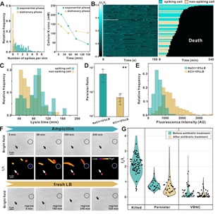 接下来,研究团队利用钾离子荧光指示探针和电感耦合等离子体发射光谱追踪细菌内离子浓度的变化,结果显示细菌的Spike现象伴随着显著的钾离子的外流。除此之外,Spike现象依赖于细菌的代谢状态,当抑制细菌代谢,细菌Spike现象也受到显著抑制(图3)。更有趣的是,通过进一步的研究发现,这种瞬时超极化现象增强了细菌的外排活性,并增强了细菌对抗生素的耐受性。通过ViBac1对细菌膜电位动态的追踪,研究团队发现细菌膜电位动态的异质性对研究细菌的抗生素耐药具有重要意义。