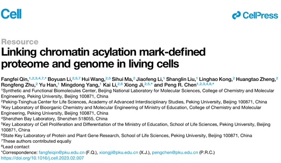 2023年3月2日,冰球突破mg正规官网季雄组与化学与分子工程学院陈鹏组合作在Cell杂志发表了题为“Linking chromatin acylation mark-defined proteome and genome in living cells”的研究论文,发展了在活细胞内“关联解析”蛋白质修饰机制与功能的“单位点-多组学”技术-SiTomics,揭示了受染色质酰化修饰介导的丰富的互作组学信息,建立了表观遗传调控的蛋白质组与基因组“信息关联”。
