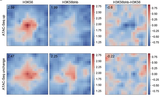 β-羟基丁酰化是与“生酮饮食法”(Keto Diet )最为密切的一个化学修饰,但目前对其的研究报道甚少。将Site-Seq技术应用于β-羟基丁酰化,作者发现带有H3K56bhb修饰的组蛋白并非随机地分布在染色质中,而无修饰的H3K56则相对随机分布。H3K56bhb确实可以增加一些染色质位点的开放性,进一步的Hi-C测序发现,单位点修饰的H3K56bhb便足以引起染色体三维结构的变化(图3)。