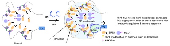 最后,通过利用Nabhb处理细胞、模拟酮体代谢下细胞内的染色质动态调控情况,结果发现超级增强子的确发生了显著变化,且与H3K56bhb的基因组整合位点相一致。此外,β-羟基丁酸处理下,受影响的超级增强子附近的基因其Pol II结合增加,而在H3K56bhb引入的细胞中,这些基因附近的Pol II结合也明显增加。进一步的RNA-seq分析证实这些发生变化的超级增强子可以帮助解释酮体代谢情况下相关基因的高表达现象,从而在分子水平上实现了“代谢-修饰-调控”轴的贯穿(图5)。