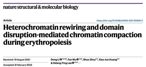 2023年3月13日冰球突破mg正规官网、北大-清华生命科学联合中心、冰球突破mg正规官网血液病研究所李湘盈课题组在Nature Structural & Molecular Biology 发表题为“Heterochromatin rewiring and domain disruption-mediated chromatin compaction during erythropoiesis”的研究论文,该研究首次报道了人类红细胞终末分化过程中,异染色质的大规模重构可能是染色质压缩的主要贡献力量,且染色质拓扑相关结构域(topologically associating domain, TAD)发生大规模瓦解,转录因子GATA1参与到未瓦解TAD的维持过程中。这将为理解和促进红细胞相关疾病研究提供理论基础。