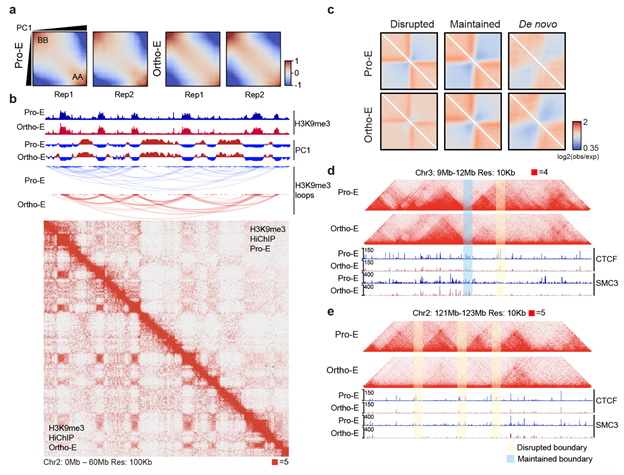 图2 红细胞终末分化过程中长距离异染色质互作形成(a-b),拓扑相关结构域-TAD瓦解(c-e)