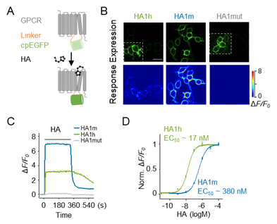 A, 组胺探针工作原理。B, 组胺探针HA1h、HA1m和HA1mut在HEK293T细胞上的表达及对组胺的反应。
