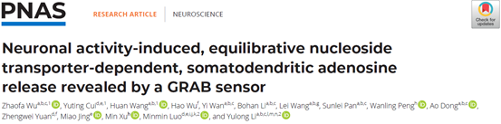 2023年3月30日,冰球突破mg正规官网李毓龙团队联合北京脑科学与类脑研究所罗敏敏团队在PNAS杂志在线发表了题为“Neuronal activity-induced, equilibrative nucleoside transporter-dependent, somatodendritic adenosine release revealed by a GRAB sensor”的研究论文。在这项研究中,作者利用新型GRAB荧光探针,详细地研究了神经元活动引发腺苷释放的细胞及分子机制,并揭示了一种非经典的神经调质释放模式。