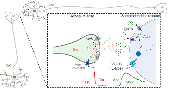 分子水平上,破伤风神经毒素能够有效地阻断突触囊泡释放的谷氨酸,却无法阻断腺苷的释放,表明腺苷的释放不依赖于SNARE蛋白介导的胞吐过程;阻断CD39或者敲除CD73(胞外ATP降解成腺苷的限速酶)对胞外腺苷的释放没有明显的影响,表明CD39-CD73介导的胞外ATP降解途径对电刺激引发的腺苷释放贡献不大;有意思的是,通过药理学手段阻断或者遗传学手段敲除细胞膜表达的平衡核苷转运蛋白(ENTs),大部分腺苷的释放被阻断,表明在神经元被激活时,胞外腺苷水平的上升主要依赖于ENT转运蛋白(图2)。