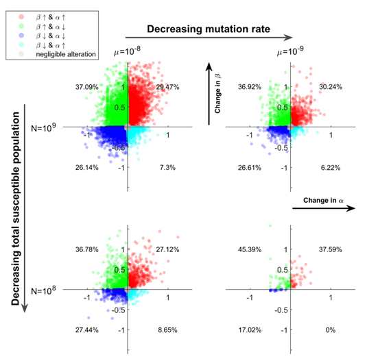 尽管存在这些长期进化趋势,但病毒进化固有的随机性不可避免地导致病毒性状的短期波动。多种参数下的模拟结果显示,有相当一部分(27.12%~37.59%)的流行毒株相对于其祖先株同时具有更高的传播力和致病力(图2)。这表明在疫情短期内出现的新变异株具有同时增强传播力和致病力的可能性。而且随着感染人数的降低或者突变率的降低,病毒短期内演化方向不确定性进一步增加。