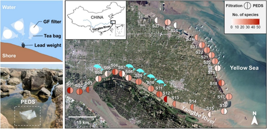 为了科学保护淡水和海洋生态系统,准确高效地评估水生生物多样性及其变化趋势至关重要。eDNA技术利用环境中脱落的DNA(例如,水、土壤、空气)而非直接捕获生物体,实现高效且非侵入性地生物群落调查。尽管eDNA技术提高了生物监测的效率和准确性,但常规的主动过滤的eDNA采集方法仍面临诸多挑战,包括劳动强度大、耗时长、滤膜易堵塞、交叉污染风险高,以及对过滤设备和电源的依赖等。本课题组研发的基于玻璃纤维滤膜的PEDS通过被动吸附收集水中的eDNA,避免了诸多主动过滤法的缺陷,提供了一种更简便、高效、经济的替代方案。然而,对于生物多样性丰富且环境复杂的自然水体,该eDNA采样方法的有效性尚未得到充分验证。