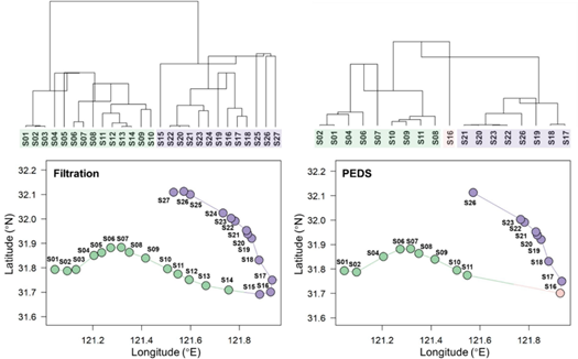 课题组在这一生物多样性极为丰富且生态环境复杂的区域利用主动过滤与PEDS两种方法进行eDNA采集,并运用eDNA metabarcoding方法进行分析。研究结果显示共计检出98种淡水和海洋鱼类,两种方法捕获的鱼类物种丰富度无显著差异(图2)。基于相对序列丰度数据的鱼类群落分析显示,两种采样方法获得的全研究区域的群落和单个样点的群落结构均相似(PERMANOVA, p > 0.05)。空间约束的层次聚类分析显示,两种采样方法均呈现出长江与海水生境鱼类群落构成的明显差异(图3)。
