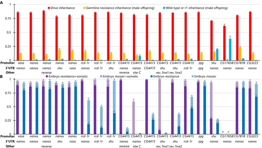 本研究中, Champer课题组以前人研究较多的nanos和vasa启动子为基础,根据黑腹果蝇早期胚胎的生殖系限定表达和低mRNA水平选择其他启动子,构建了两种类型的驱动系统 。其中,合成驱动系统的Cas9元件和gRNA驱动元件位于同一等位基因中,并靶向EGFP基因[3]。测试结果表明,大多数启动子在雄性中的驱动遗传率为72-89%,在雌性中为85-95%,其中只有rcd-1r, shu和CG4415启动子展示出明显较低的胚胎抗性等位基因形成率。由于测试品系中的EGFP只在果蝇眼部表达,因此该合成驱动系统只能观察Cas9/gRNA在眼部的切割活动,无法评估体细胞和胚胎抗性的发生情况。