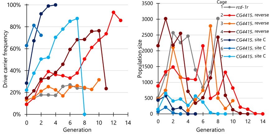 在之前的研究中,Champer课题组发现果蝇的nanos启动子,在单管杂交中展示出较少的适合度代价,但在笼子种群中有着明显提高的适合度代价,这可能与nanos启动子的高胚胎抗性有关[4]。本研究中,Champer课题组选择了三个Cas9品系进行多代笼子实验,其中一个为rcd-1r启动子和shu 3’UTR的组合,另外两个为CG4415启动子和nanos 3’UTR的组合(其中一个EGFP与Cas9方向一致,另一个放置于不同的染色体臂中)。在由rcd-1r启动子表达Cas9的笼子1中,驱动载体频率缓慢增加,但始终低于27%,仅达到一个较低的平衡值。而由CG4415启动子表达Cas9的笼子2,驱动载体频率增加较快,并且笼子种群最终得到抑制。后续实验分别为大部分使用了较干燥的食物和仅使用了新鲜的食物,更为干燥的食物一组(笼子3)仅能达到平衡,新鲜的食物一组(笼子4)可支持了笼子2结论。此外,本研究还使用了位于“site C”位点的CG4415- Cas9元件分别进行了三次笼子试验(笼子5-7),由于Cas9元件带有的雌性杂合子适合度代价较低,驱动载体频率增加并且最终抑制了种群,但是这些笼子的种群规模相对较低。本研究认为,CG4415启动子在笼子中的适合度代价明显低于nanos启动子和rcd-1r启动子。并且与nanos启动子相比,CG4415启动子的胚胎抗性显著降低,这足以抑制大型、强健的果蝇笼子种群。