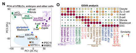 图3.与已知的各种细胞不同,hTBLCs在转录组水平上具有独特的pre-ZGA特征。