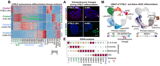 图4. 基于hTBLCs的自发分化体系能够模拟人着床前胚胎发育