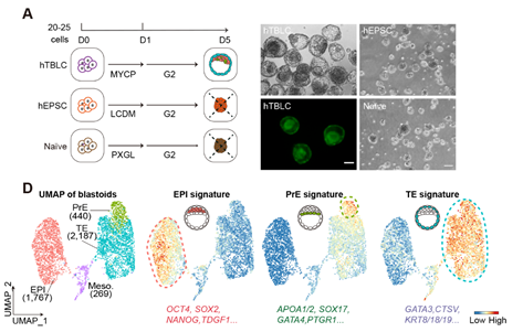 图5. hTBLCs能够在人胚胎培养基中, 在不添加任何小分子的条件下,产生类囊胚。