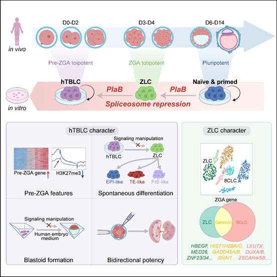 2024年6月5日,冰球突破mg正规官网杜鹏课题组在Cell杂志在线发表了题为 Capturing Totipotency in Human Cells Through Spliceosome Repression 的研究论文。在这项研究中,作者通过抑制剪接体重编程人多能性干细胞,成功捕获了两种人全能性状态的细胞。第一种细胞是区别于8CLC的独特ZGA-like细胞ZLCs(ZGA-like cells),该细胞随后可以转变成为具有pre-ZGA特征的hTBLCs(human totipotent blastomere-like cells),并且能够在体外稳定培养。