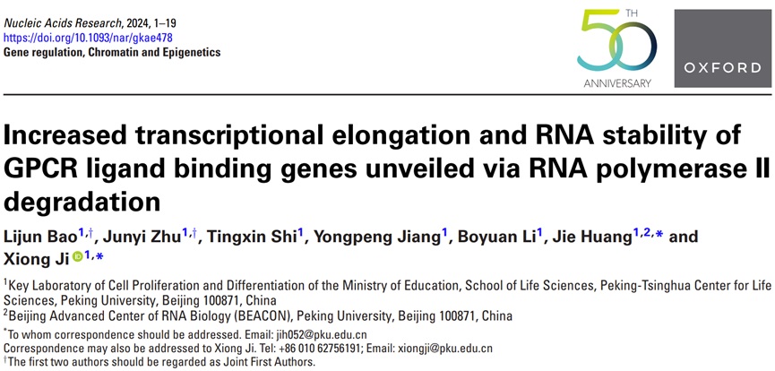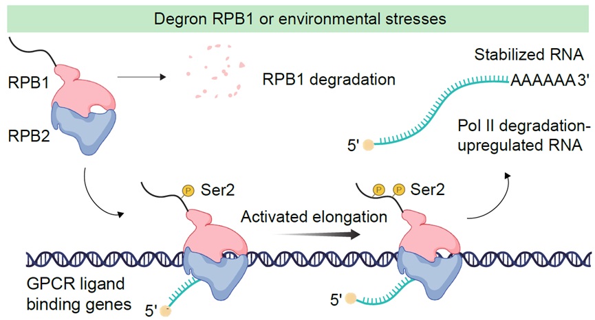 2024年6月6日 ,冰球突破mg正规官网、北大-清华生命科学联合中心季雄课题组在Nucleic Acids Research发表了题为“Increased transcriptional elongation and RNA stability of GPCR ligand binding genes unveiled via RNA polymerase II degradation”的研究论文。本研究的结果显示Pol II的大亚基RPB1蛋白降解会导致全局性的基因表达下调,但与G蛋白偶联受体(GPCR)配体结合相关的一小部分基因却会上调表达,原因是这些基因的转录延伸和mRNA稳定性增加。在外部环境刺激引起Pol II的大亚基降解后,这一现象同样被观察到,表明细胞通过提高GPCR配体结合相关基因的转录延伸和RNA稳定性来应对细胞中转录全局下调引发的反馈机制。