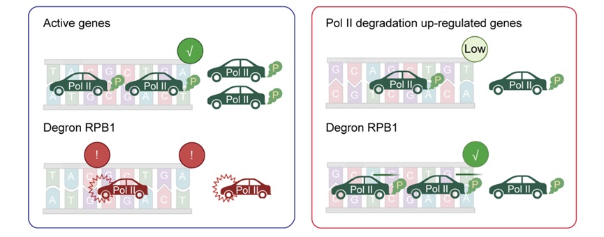 DNA损伤常导致RNA聚合酶II (Pol II) 蛋白的降解,化学物质抑制转录、UV照射,以及血清饥饿也可引发该蛋白的降解。然而,Pol II蛋白水平下降后,其具体的分子调控网络变化和相关机制仍不清楚。季雄团队早前利用蛋白质瞬时降解系统,研究了Pol II的全部12个亚基的具体功能分工。结果发现大多数亚基的降解会导致全局的基因表达下调,但意外地观察到一小部分基因表达上调的情况。本研究在此基础上进一步探讨了Pol II大亚基蛋白的降解导致转录水平上调基因的特征,阐明了这些基因表达上调的原因。此外,本研究还关注外界环境刺激条件下引起Pol II降解的情形,揭示类似的调控机制也可能会发生。