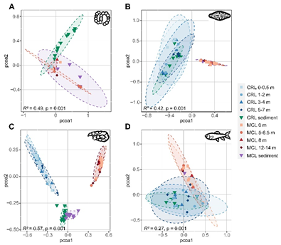 图4 水和沉积物样本中四个生物类群OTU组成的主坐标(PCoA)分析