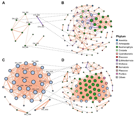 图5 长热湖(A)水样和(B)沉积物及芒错湖(C)水样和(D)沉积物中的多营养级共现网络