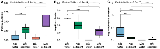 图6 不同湖泊生境类型中生物共现网络(A)正凝聚力指数、(B)负凝聚力指数和(C)负:正凝聚力指数的比较