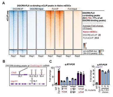 为了进一步研究DGCR8如何抑制这类基因的转录,在naïve小鼠胚胎干细胞中,作者通过eCLIP实验鉴定了DGCR8/FLII的RNA结合靶点,同时在eCLIP实验中还掺入了S4U,可以同时鉴定出新生的RNA (nascent RNA)。作者发现DGCR8和FLII同时结合了大量的靶基因的新生mRNA,且DGCR8结合区域倾向于形成茎环结构(图3.A-B)。该茎环结构显著短于pri-miRNA上的茎环结构,并不能被DGCR8和DROSHA形成的复合体结合并切割。通过敲除DGCR8所结合的位于靶基因mRNA上的茎环结构,靶基因的转录抑制状态被解除 (图3.C)。这证明DGCR8确实通过结合mRNA上的茎环结构来抑制转录。