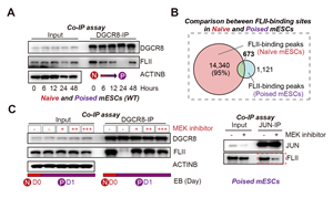 图5: A:DGCR8与FLII在Poised mESCs中解除互作。B:FLII的RNA结合信号在poised mESCs中消失。C:在Poised时期抑制MEK/ERK通路阻止DGCR8/FLII的解离,抑制FLII/JUN复合体的形成。