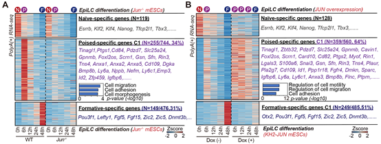 图6: A:缺失Jun的细胞无法激活细胞迁移基因及Poised多能性。B:JUN的过表达导致细胞迁移基因的过度激活且激活时间延长,使得Poised多能性持续的时间延长。