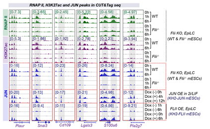 作者进一步探究了FLII在JUN激活基因表达中的作用,作者在多种细胞系中进行了CUT&Tag实验,结果发现: JUN广泛的结合在Poised时期激活的细胞迁移基因的启动子/增强子上,且Flii缺失后,JUN几乎完全丧失了DNA结合能力,此外,FLII过表达可以显著增强JUN的结合能力。以上结果说明FLII通过促进JUN对DNA的结合来实现转录激活作用 (图7)。