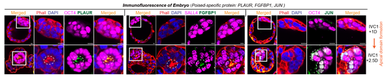 图8:Poised mESCs的标记蛋白定位于着床期胚胎的极化中心(PLAUR/FGFBP1)或者上胚层细胞(JUN)中。