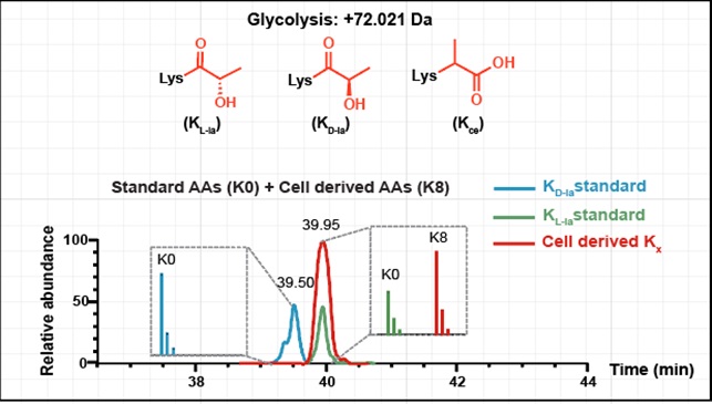 2019年,芝加哥大学的赵英明教授团队在《自然》杂志上首次揭示了Warburg效应的产物L-乳酸能够驱动一种新型蛋白质修饰-赖氨酸乳酰化,张迪研究员担任该研究的第一作者。随后该修饰的立体异构体修饰,赖氨酸D-乳酰化(KD-la)也被发现存在于细胞中。KD-la是通过乙二醛酶途径产生的S-D-乳酰谷胱甘肽(LGSH)与蛋白质发生的非酶催化反应形成。乙二醛酶途径,一个高效的细胞解毒系统,由乙二醛酶1(GLO1)和乙二醛酶2(GLO2)两种酶组成,GLO1将糖酵解副产品甲基乙二醛(MGO)与谷胱甘肽结合形成LGSH,而GLO2则将其水解,生成D-乳酸并再生谷胱甘肽。MGO的高反应性使其能与多种蛋白质残基反应,包括半胱氨酸、精氨酸和赖氨酸,其中与赖氨酸反应形成的N-ε-(羧乙基)赖氨酸(Kce)已在细胞中发现,尽管其水平低于MGO衍生的精氨酸残基修饰。目前,由于KL-la、KD-la和Kce具有相同的分子量和结构相似性,通过高效液相色谱-质谱(HPLC-MS)分析难以区分它们,且KD-la和Kce是否能响应细胞糖酵解的动态变化尚不明确。