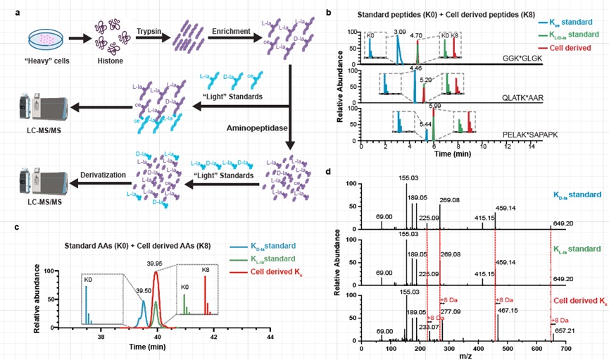 为了解决这些基本问题,本研究开发并应用了一系列正交技术,涵盖了分析化学、化学生物学和免疫学方法,专门用于区分KL-la、KD-la和Kce这三种乳酰化异构体。通过这些方法的建立和应用,本研究证明了KL-la是细胞组蛋白上的主要乳酰化形式,其产生受高葡萄糖浓度和糖酵解过程的诱导,并且与代谢物乳酰辅酶A(lactyl-CoA)的浓度呈正相关。此外,研究还发现,在糖酵解的下段途径受阻或乙二醛酶系统功能不完整的情况下,KD-la和Kce可以产生并且受葡萄糖浓度影响,进一步揭示了这些异构体在细胞代谢调节中的复杂性。