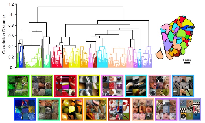 借助模型在大量自然图片中搜索皮层各处的偏好图片,作者绘制出了V4脑区的偏好地图。基于偏好地图的聚类分析将V4划分成了多个偏好不同类型图片的功能区。这些功能区有的偏好特定颜色或纹理的表面、有的偏好特定朝向的边界、还有的偏好特定类型的物体。