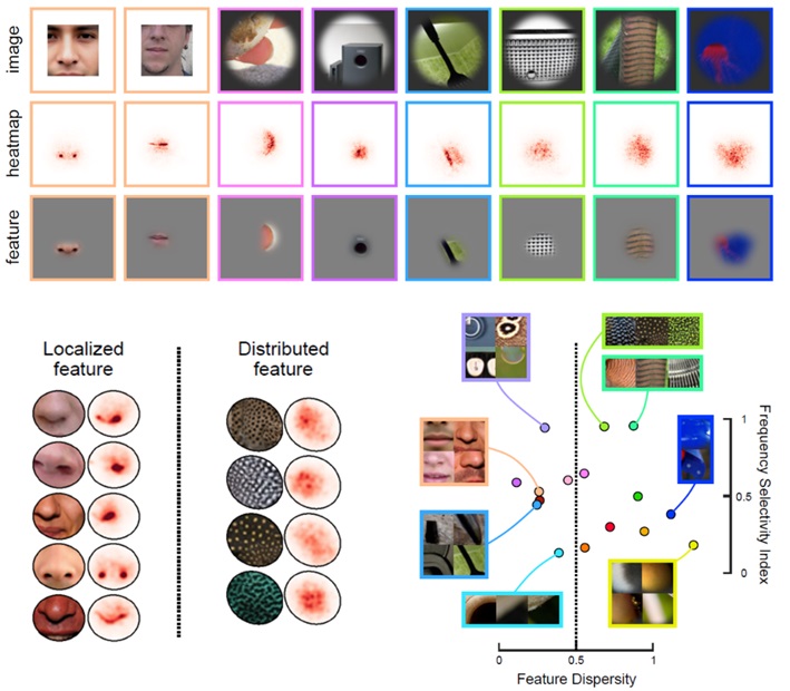 作者进一步用模型对功能区偏好的自然图片进行了特征贡献分析,以明确是哪部分图片特征激活了皮层反应。结果显示,那些偏好特定类型物体的V4功能区,实际表征的是物体的局部元件,如面孔中的鼻子嘴巴、圆形物体的圆边。特征贡献分析还发现V4功能区的偏好特征在感受野内呈现出不同的分布模式:有些功能区偏好局域分布的形状相关特征,而另一些则偏好弥散分布的表面相关特征。这种以特征分散程度为标志的分区结构或许反映了某种神经计算的组织原则。