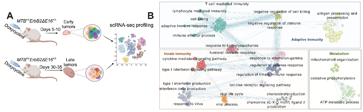 图1.早期肿瘤编辑优先下调免疫相关基因表达。A,为探究早期肿瘤进展中的基因编辑及肿瘤-免疫细胞间的通信动态变化,研究人员在Erbb2ΔEx16 转基因小鼠中诱导侵袭性乳腺癌,并在诱导约一周或一个月后收集早期或晚期肿瘤样品,通过单细胞转录组测序进行比较分析。 B,晚期肿瘤中下调的229个基因显著富集的179个Gene Ontology (GO)通路的互作网络,网络由GO通路的相似性及其共享基因决定。节点大小与富集通路的显著性正相关。结果显示早期肿瘤编辑中,先天免疫、适应性免疫及线粒体代谢途径相关基因表达被优先抑制。