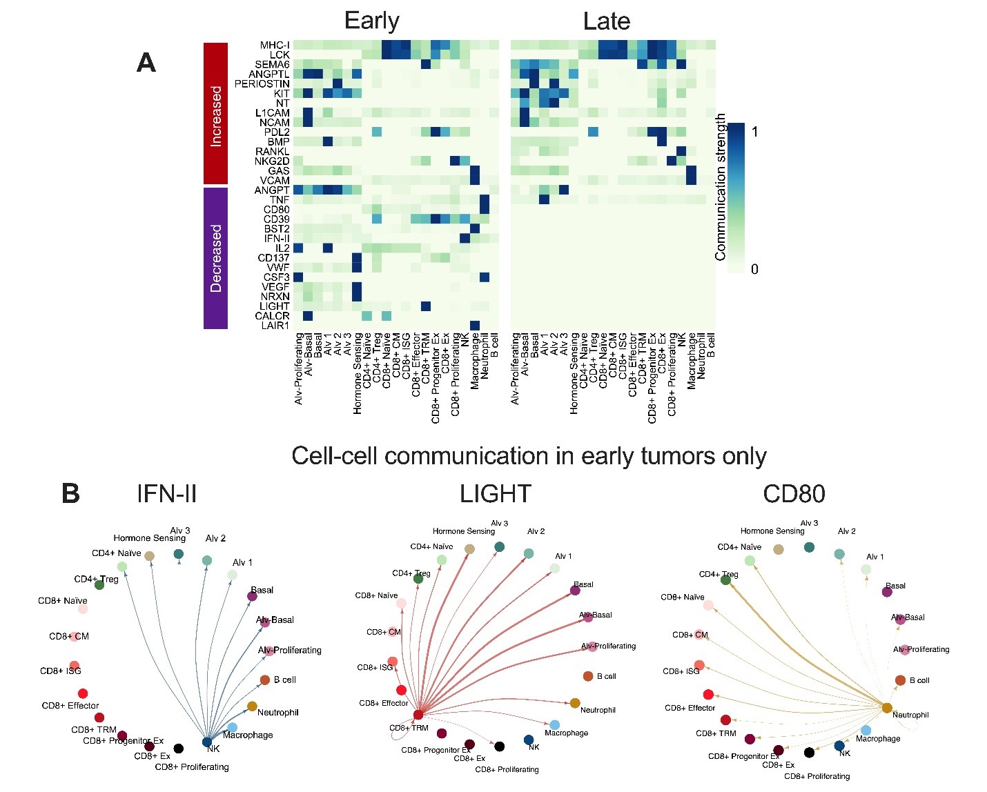 图2.肿瘤早期进展中肿瘤-免疫细胞间的细胞通讯受到破坏。A,早期和晚期肿瘤中的细胞间通讯变化最显著的前30条互作通路(CellChat分析)。多条免疫相关互作通路在晚期肿瘤中完全消失。B,早期肿瘤中三条活跃的肿瘤-免疫细胞通讯途径,包括II型干扰素及共刺激因子信号通路在晚期肿瘤中完全消失。图中线的颜色与细胞通讯中表达配体的细胞节点颜色一致,线条指向表达受体的不同细胞亚群。线的宽度代表通讯信号的强度。