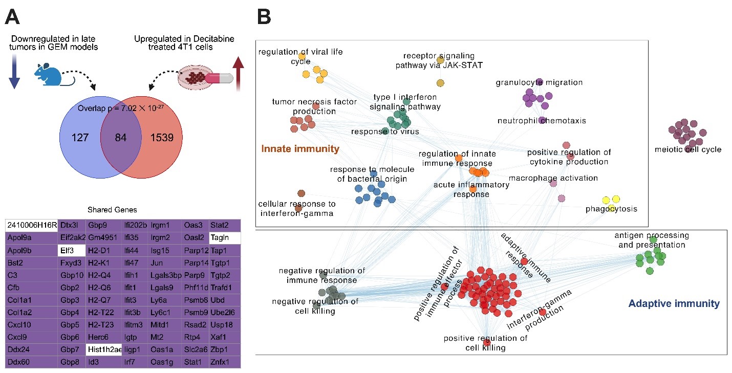图3. DNA甲基化在肿瘤编辑及肿瘤免疫原性调控过程中的重要作用。A,为探究DNA甲基化对早期肿瘤基因表达调控及肿瘤免疫原性的影响,研究人员使用PBS或地西他滨(DAC)处理小鼠乳腺癌4T1细胞系48小时后进行转录组测序。本研究同时将Erbb2ΔEx16 转基因小鼠晚期肿瘤相对于早期肿瘤显著下调基因与DAC处理4T1系后显著上调基因进行重叠分析。上:韦恩图显示两数据集中非重合(蓝色,红色)及重合部分基因数;下:表格显示84个显著重叠基因,其中紫色高亮基因为干扰素刺激基因(Interferon Stimulated Genes,ISGs),证明早期肿瘤编辑中DNA甲基化是抑制免疫基因表达的一种关键机制。B,DAC处理4T1细胞后显著上调基因所富集的前150个最显著GO通路的互作网络,结果显示DNA去甲基化治疗优先上调先天及适应性免疫相关基因,提升肿瘤免疫原性。