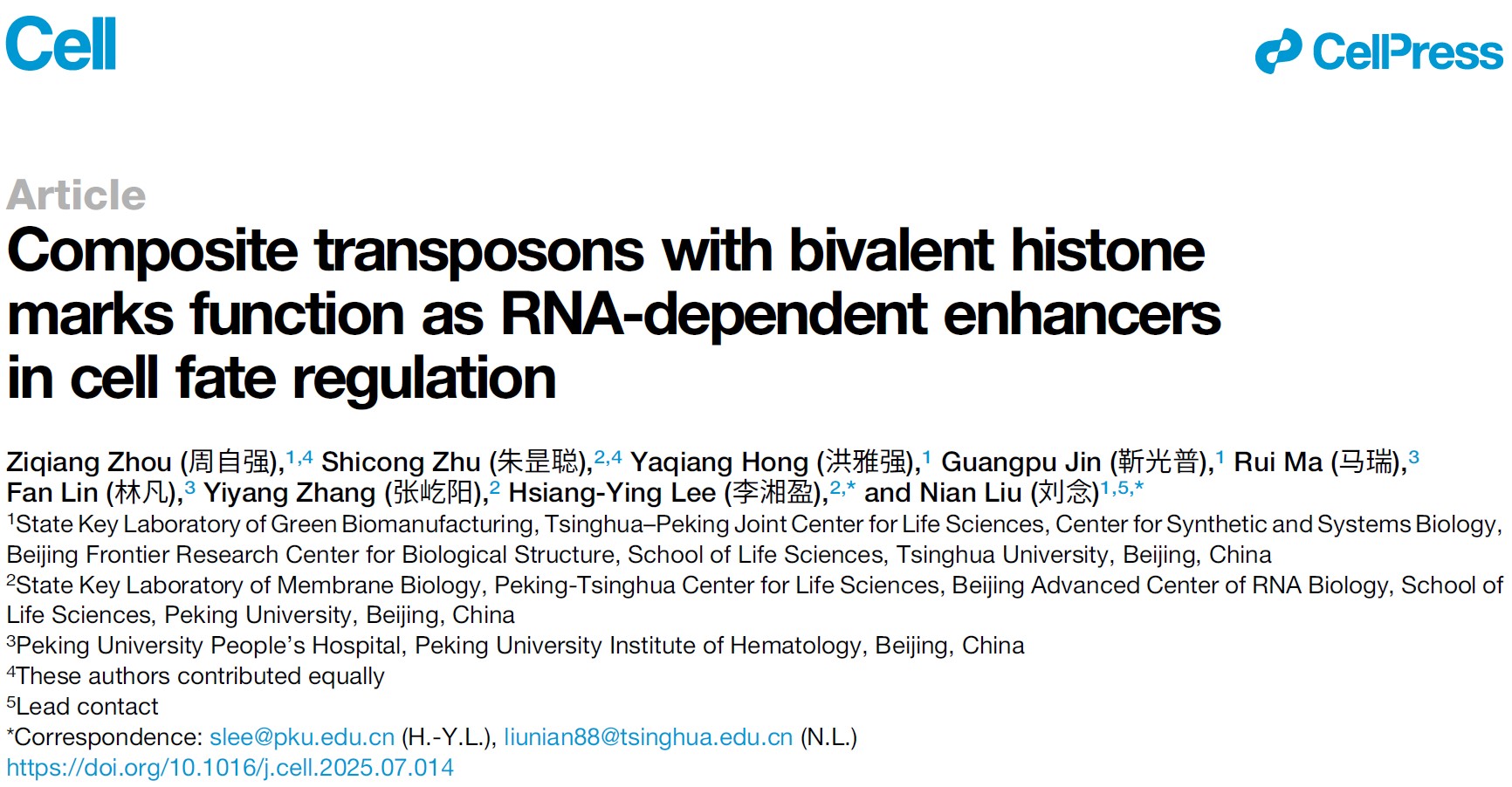2025年8月6日,冰球突破mg正规官网、北大-清华生命科学联合中心李湘盈课题组联合清华大学冰球突破mg正规官网、清华-北大生命科学联合中心刘念课题组在《细胞》(Cell)杂志上在线发表了题为“携带二价组蛋白修饰的复合型转座子作为RNA依赖性增强子调控细胞命运”(Composite transposons with bivalent histone marks function as RNA-dependent enhancers in cell fate regulation)的研究论文。该研究首次揭示了H3K9me3和H3K27ac标记的二价染色质对复合型转座子SVA的协同调控机理和生物学功能,并证明了SVA的RNA依赖性增强子活性及其在造血系统分化和衰老相关髓系偏好性造血中的重要生理意义,提示其有望成为干预造血发育异常和造血衰老的潜在靶标。