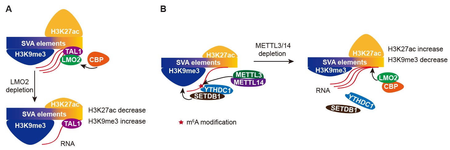 为了探究二价染色质对于复合型转座子的调控机理和生物学功能,研究人员以代表性的复合型转座子SVA为研究对象。首先,通过构建SVA的表达报告系统并运用全基因组筛选策略,研究人员找出了SVA的161个抑制因子和237个激活因子,这些调控因子涉及功能多样的调控通路和蛋白互作网络。通过流式和RNA-seq,研究人员验证了其中部分调控因子,并且分析发现具有二价染色质修饰的SVA更倾向于被调控因子所调节。接着,研究人员选取了其中的激活因子LMO2和抑制因子METTL3/14进行了深入探究。结果显示(图1),LMO2通过TAL1结合到SVA的3’端,并招募组蛋白乙酰转移酶CBP在SVA的3’端加上H3K27ac。当LMO2敲除后,SVA的3’端H3K27ac减少,而5’端H3K9me3增加,从而导致SVA表达下调。相反,METTL3/14通过在SVA的RNA上加上m6A修饰,进而招募YTHDC1/SETDB1,在SVA的5’端加上H3K9me3,METTL3/14敲除后,SVA的5’端H3K9me3减少,而3’端LMO2、CBP富集增加,进而使H3K27ac增加,SVA表达升高。