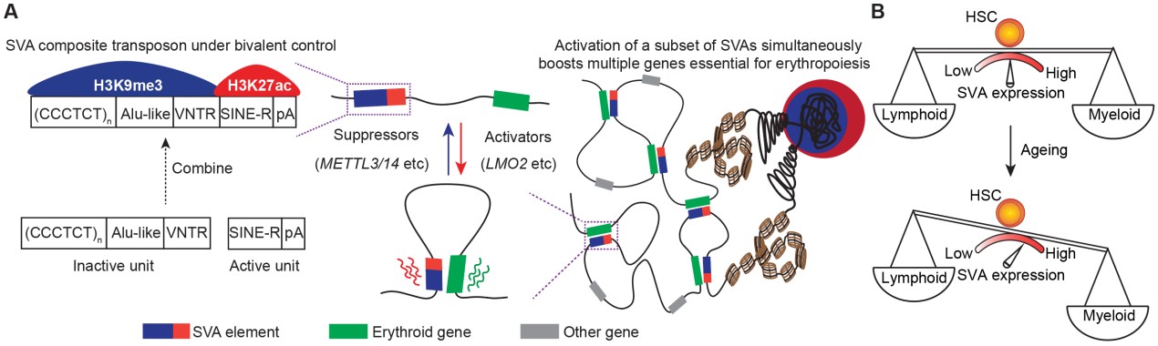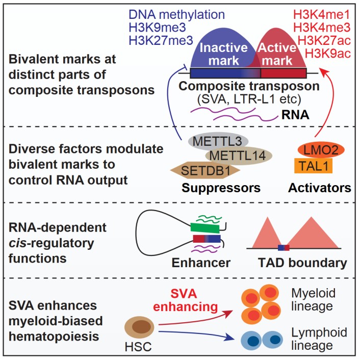 综上所述,该研究工作发现了H3K9me3/H3K27ac标记的二价染色质富集在复合型转座子SVA的不同功能区域上,并且调控因子对二价修饰的协同调控可以动态精确地控制SVA的表达水平,进而调控SVA的增强子功能,最终影响造血系统分化和衰老(图3)。