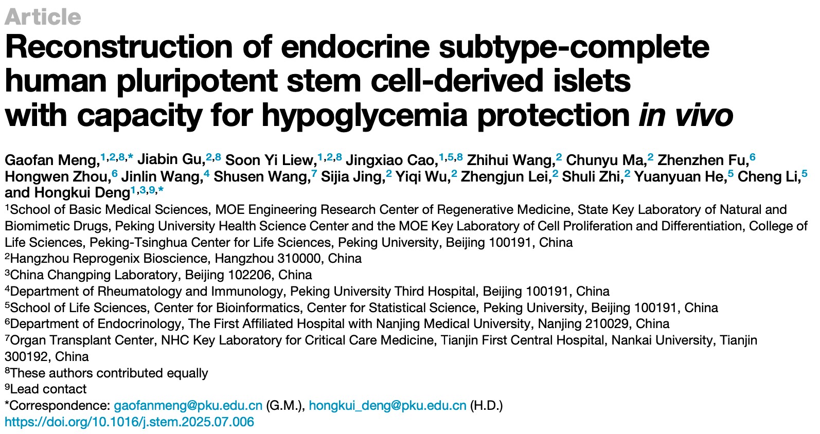 2025年8月8日,冰球突破mg正规官网邓宏魁课题组在国际学术期刊Cell Stem Cell发表题为“Reconstruction of Endocrine Subtype-complete Human Pluripotent Stem Cell-derived Islets with Capacity for Hypoglycemia Protection in vivo”的最新研究成果(图1)。该研究首次利用人多能干细胞成功分化构建了内分泌细胞类型完备的胰岛。这些胰岛能够高效响应血糖浓度变化,不仅能够有效降低血糖,更具备关键的升血糖功能,在糖尿病小鼠模型中展现出有效的低血糖防护能力,解决了干细胞来源的胰岛细胞类型及功能不全面的难题。