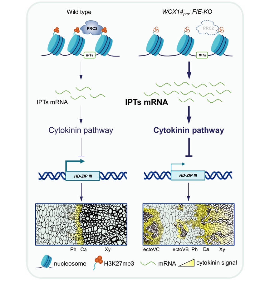 贺新强课题组与周岳课题组通过组织特异基因敲除技术(Tissue-specific knockout, TSKO)创制了PRC2成员FIE(FERTILIZATION INDEPENDENT ENDOSPERM)的维管组织特异性敲除突变体WOX14pro: FIE-KO,研究发现FIE突变后会在韧皮部薄壁组织区域内形成异位维管束(Ectopic vascular bundles,ectoVB)和维管柱(Ectopic vascular cylinders,ectoVC),同时木质部中网纹/孔纹导管以及纤维的分化过程受阻。转录组测序和染色质免疫沉淀 (ChIP) 分析结果表明,FIE直接调控细胞分裂素生物合成基因IPT1/3/5/7(ISOPENTENYLTRANSFERASE1/3/5/7)的H3K27me3水平,从而抑制其转录,并调控下胚轴中细胞分裂素的空间分布和响应。通过遗传回补试验干扰细胞分裂素的生物合成或信号转导,能够部分抑制FIE敲除后下胚轴中的维管发育缺陷。此外,本研究还发现木质部发育核心调控基因 HD-ZIP III家族转录因子作用于 FIE-IPTs下游,且在WOX14pro: FIE-KO中过表达HD-ZIP III家族成员ATHB8(ARABIDOPSIS HOMEOBOX GENE 8)也能部分恢复维管组织发育表型。