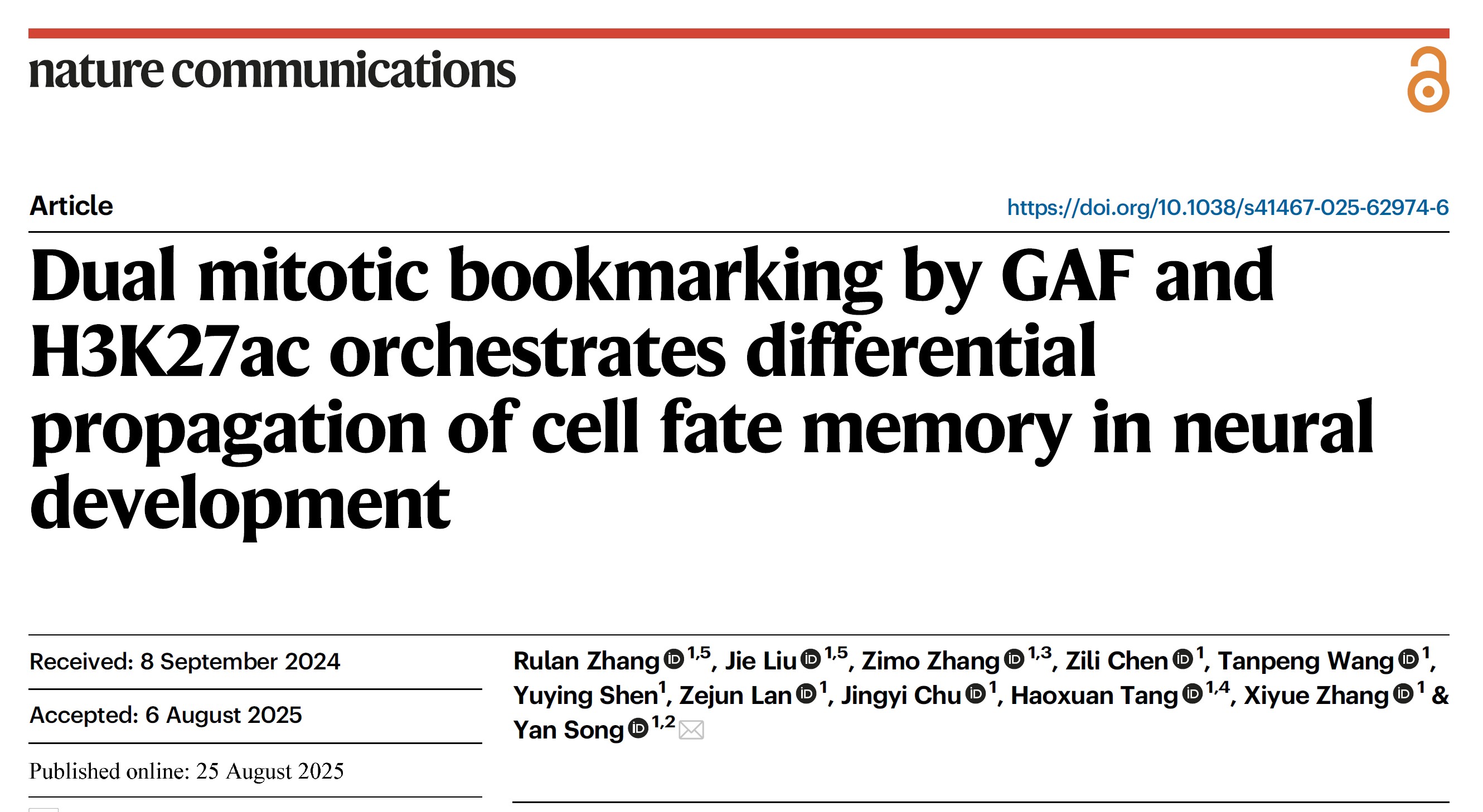 8. Zhang R.#, Liu J.#, Zhang Z., Chen Z., Wang T., Shen Y., Lan Z., Chu J., Tang H., Zhang X. and Song Y.* (2025) Dual mitotic bookmarking by GAF and H3K27ac orchestrates differential propagation of cell fate memory in neural development. Nature Communications. doi.org/10.1038/s41467-025-62974-6
