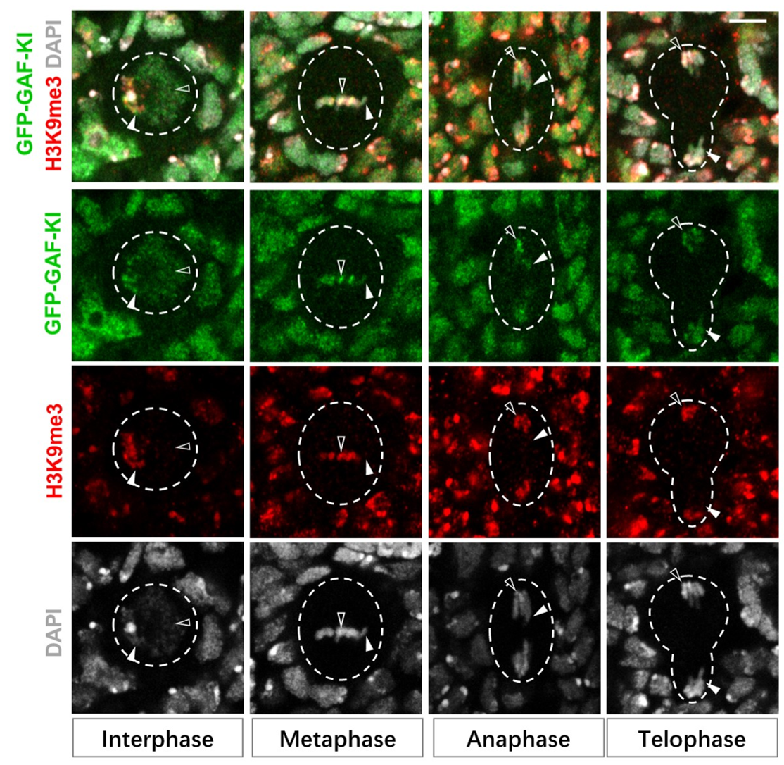 图1. 书签蛋白GAF保留在果蝇神经干细胞分裂期染色体上