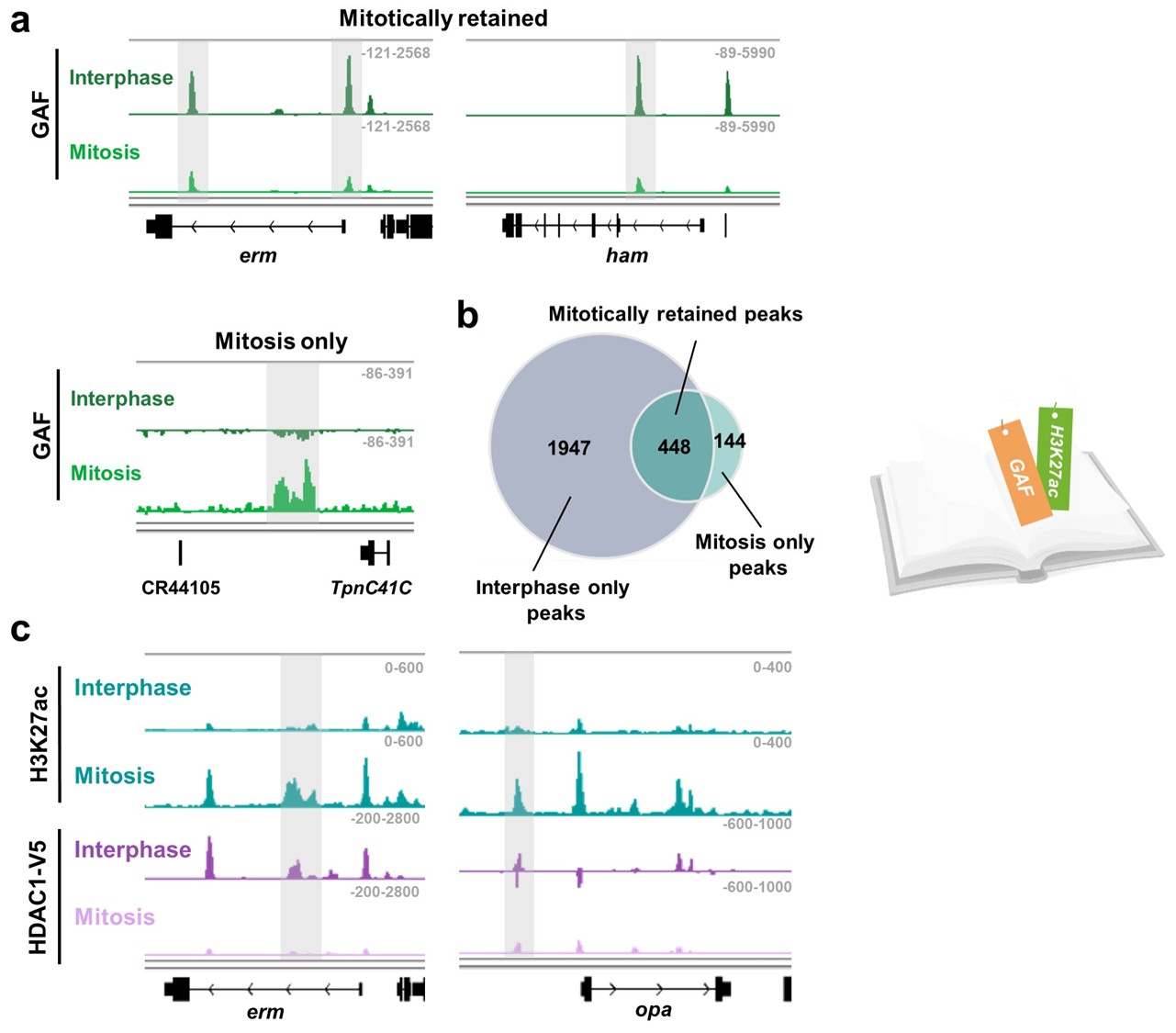 图2. 关键促分化基因在分裂期被GAF和H3K27ac 有丝分裂书签“双重标记”