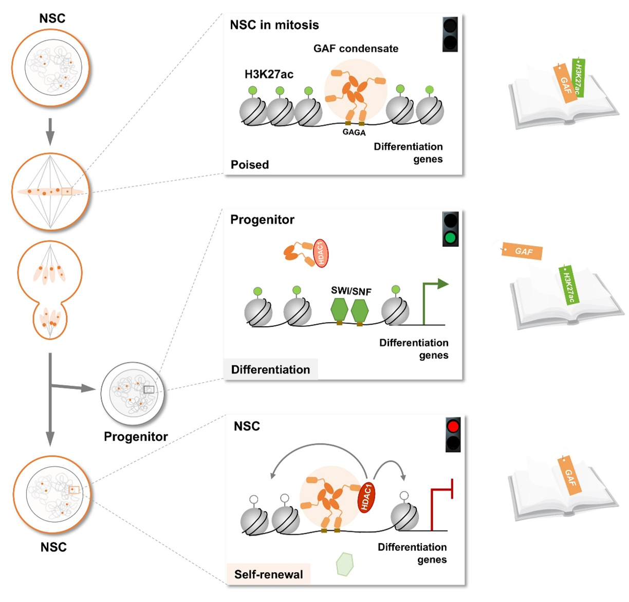 借助实验室新近开发的鉴定发育脑中有丝分裂书签基因组结合位点的BISMIB组学技术 (Shen et al., STAR Protocols, 2025) 9 并结合精细的果蝇分子遗传学、细胞生物学、液-液相分离、生物化学和其它多组学技术,研究人员发现,在果蝇中脑区II 型神经干细胞不对称分裂过程中,关键促分化基因位点被先锋因子GAF(GAGA因子)及组蛋白修饰H3K27ac两个有丝分裂书签“双重标记”。在新生的维持神经干细胞命运的子细胞中,GAF通过组蛋白去乙酰化酶HDAC1介导的H3K27去乙酰化“删除”H3K27ac 书签,及时抑制促分化基因的转录,进而确保神经干细胞自我复制的命运;与之相反,在即将分化为神经祖细胞的子细胞中,GAF在关键促分化基因位点上的结合被染色质重塑复合体SWI/SNF竞争性取代,H3K27ac标记因此得以保留并快速激活促分化基因的表达,进而确保神经祖细胞趋向分化的命运。因此,本研究揭示了一种全新的“拮抗性双重有丝分裂书签标记与选择性分子竞争相结合”的机制,实现细胞命运记忆在姐妹子细胞中的差异性继承。