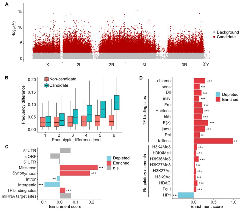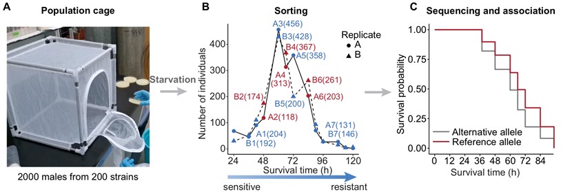 研究首先基于课题组前期开发的群体箱混合分选测序方法(Chen et al., 2024),在中国多地区采集的200个黑腹果蝇单雌系中筛选出与饥饿耐受相关的SNP位点。该方法在统一实验条件下对不同遗传背景的果蝇进行表型分选,结合混池测序与统计分析,揭示了自然群体中既有变异与表型之间的关联(图1)。