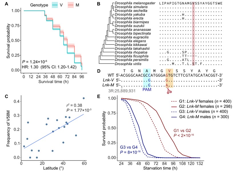 在饥饿耐受相关位点中,研究关注到胰岛素样受体信号通路中的关键基因Lnk的一个错义突变V58M,该位点在其他果蝇物种中高度保守,但在黑腹果蝇自然群体中存在多态性,其频率与纬度呈正相关,提示该变异可能参与环境适应。通过CRISPR/Cas9构建Lnk-M和Lnk-V两种转基因果蝇品系,研究发现Lnk-M基因型的果蝇饥饿耐受性显著增强,且在雌性中表型效应更为突出(图3)。