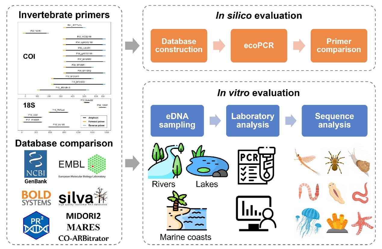 全球水生态系统面临日益严峻的生物多样性丧失,威胁生态系统稳定性及其关键服务功能。高效、精准的生物监测技术是合理有效的生态保护和管理重要前提。无脊椎动物在生态系统中发挥重要功能,也是水生生态系统健康的关键指示类群。然而,无脊椎物种多样性占全部动物的95%以上,对基于形态分类的传统调查方法造成极大挑战。环境DNA(eDNA)宏条形码技术利用生物释放到环境中的DNA进行生物检测,具有高效、灵敏、可规模化、非侵入性的优势,已成为水生生物多样性调查的重要手段。eDNA方法的准确性高度依赖通用引物的性能。然而,目前仍缺乏针对无脊椎动物宏条形码引物的系统性比较评估,制约了该技术在无脊椎动物多样性监测中的标准化应用。